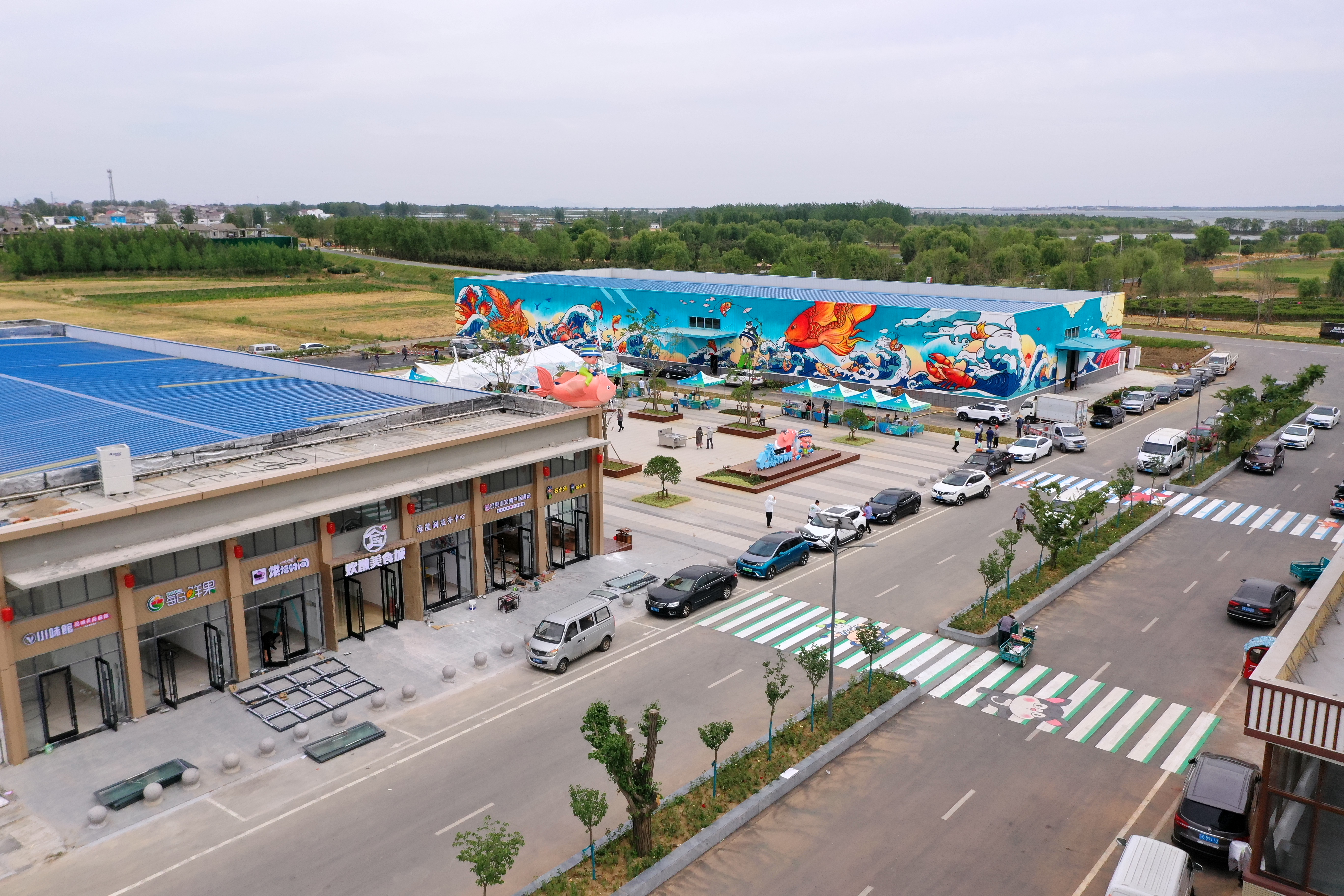 美味之余,美观作底。自石梁鲜街精神堡垒向街区望去,主题墙面彩绘装点下的欢墩美食城明艳活泼,石梁河文旅IP形象“石小海”、“喵小良”在彩绘图案中以各种情境情节出现,成为“有故事的人”。在美食城房顶,骑着大鱼的石小海远眺着游人如织,甚是可爱;大渔海TOWN的地标雕塑,“喵小良”趴在巨鱼身上,随主人“石小海”乘风破浪。螃蟹等卡通图案组成的斑马线地面彩绘将游客沉浸式主题体验精确到“每一步”;“鱼府”、“羊羊得意”、“鱼东家”等特色餐饮店浓浓的地域风味,“鲜”味道仿佛要溢出每块瓷砖。
