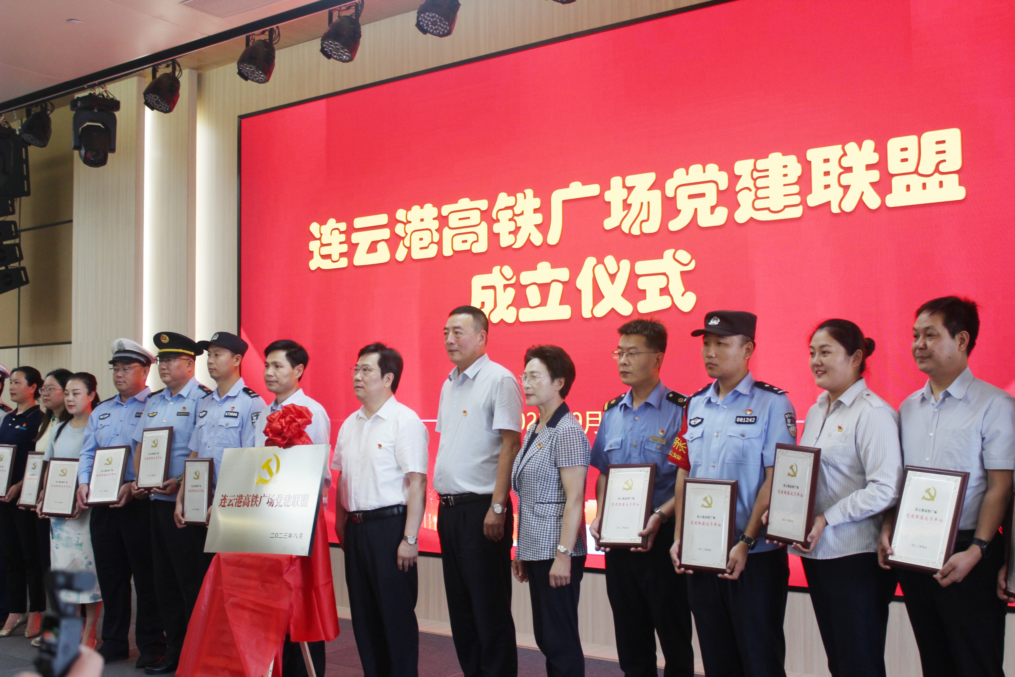 揭牌仪式上,市城管局副局长周洪坤宣读《关于成立高铁连云港站广场党建联盟的决定》,市委市级机关工委常务副书记李佺,市城管局局长蒋应柏为“连云港站广场党建联盟”揭牌,随后为首批15家联盟成员单位授牌。